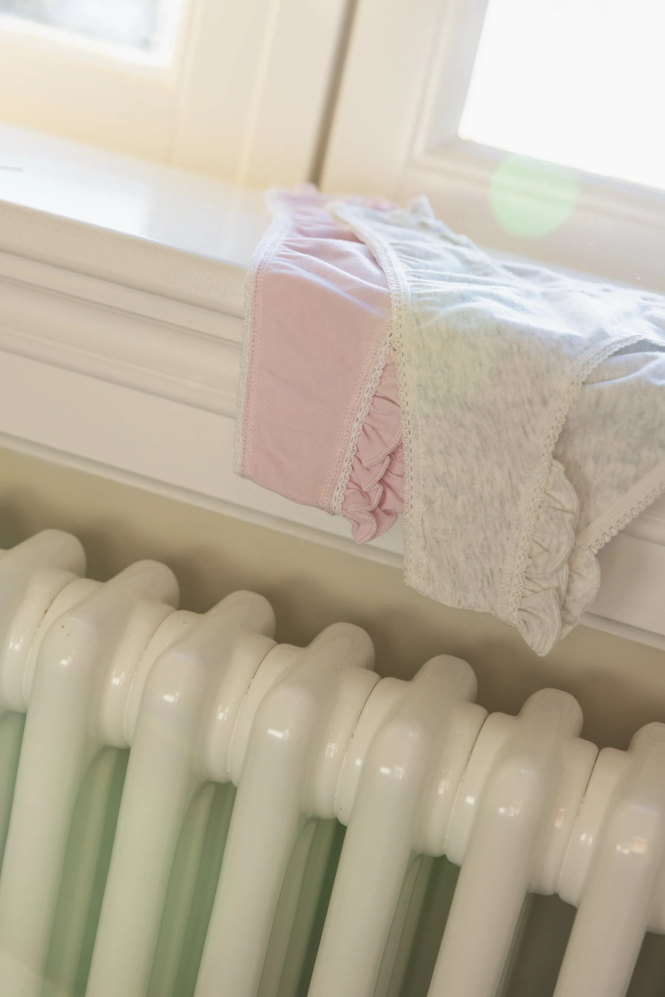 Two briefs crafted from soft cotton jersey with delicate lace edges. Pink poudree brings a subtle charm, while Grey nuage lends quiet sophistication.