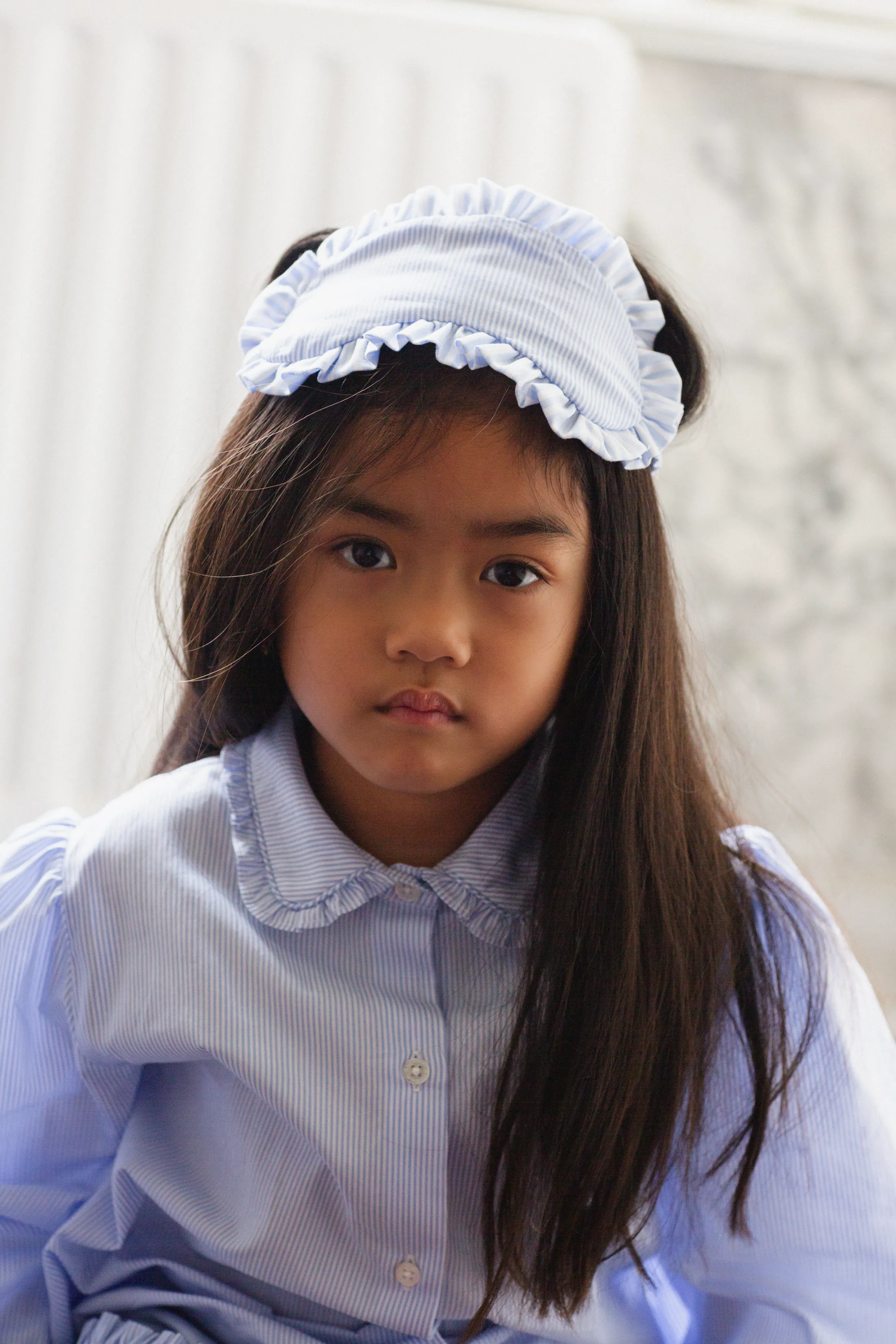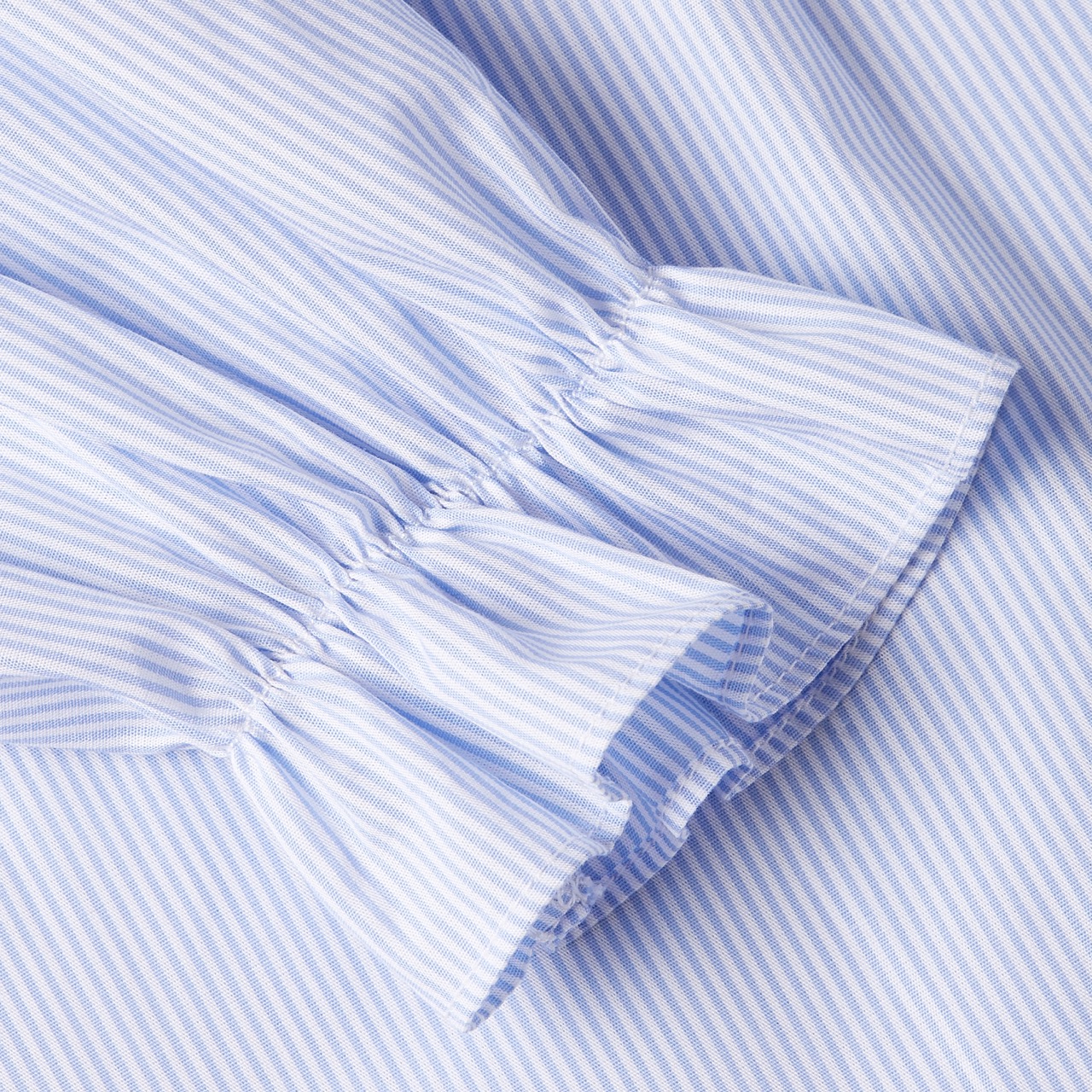 Nightdress in woven cotton with a soft drape and subtle stripe pattern. The A-line cut and ruffled details at cuffs and hem add airy movement, while Porcelain blue enhances its serene, graceful tone.
