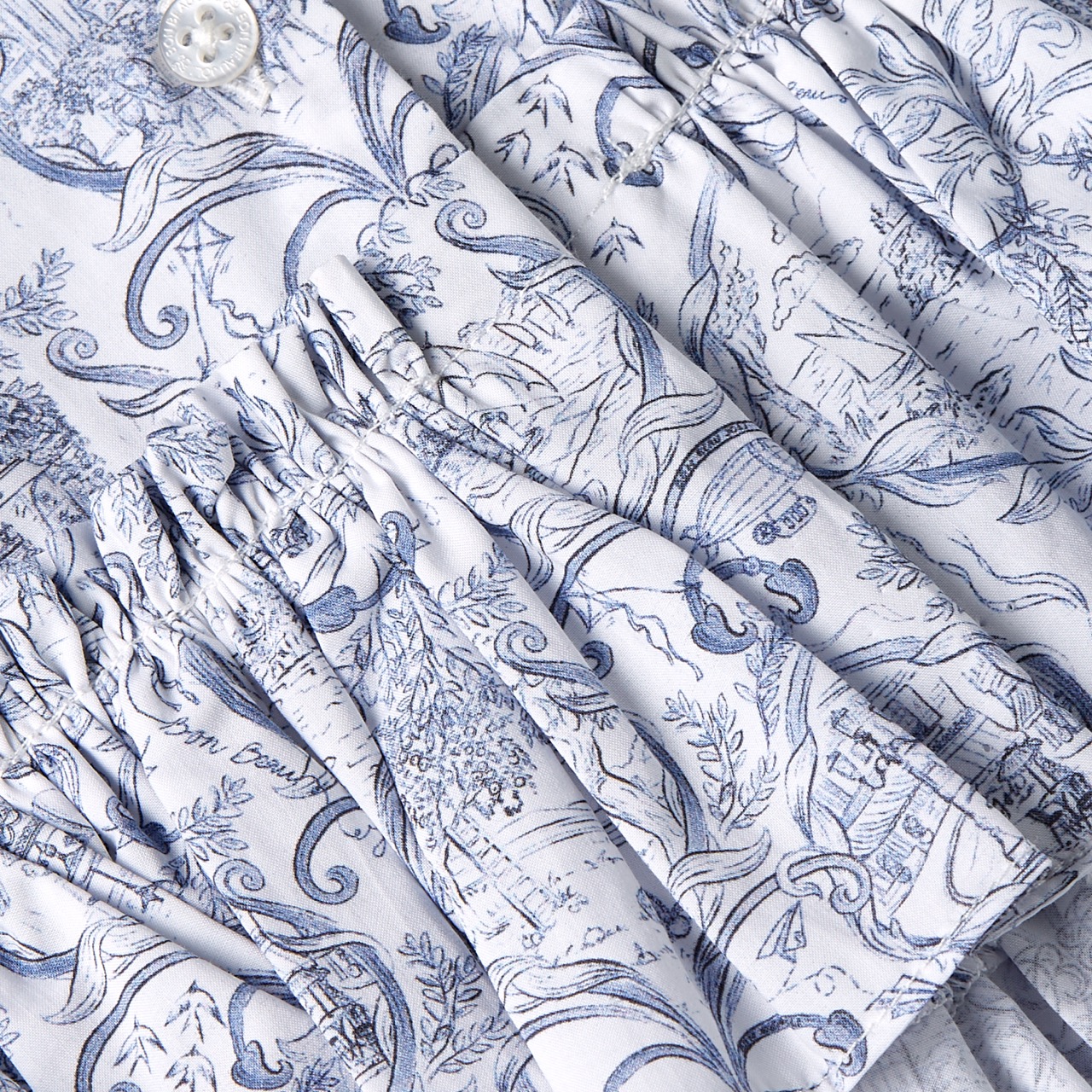 Nightdress crafted from lightweight poplin cotton with a gentle structure and soft stripe texture. The A-line silhouette flows beautifully with romantic ruffles, and the Toile de reve print adds an evocative, nostalgic spirit.