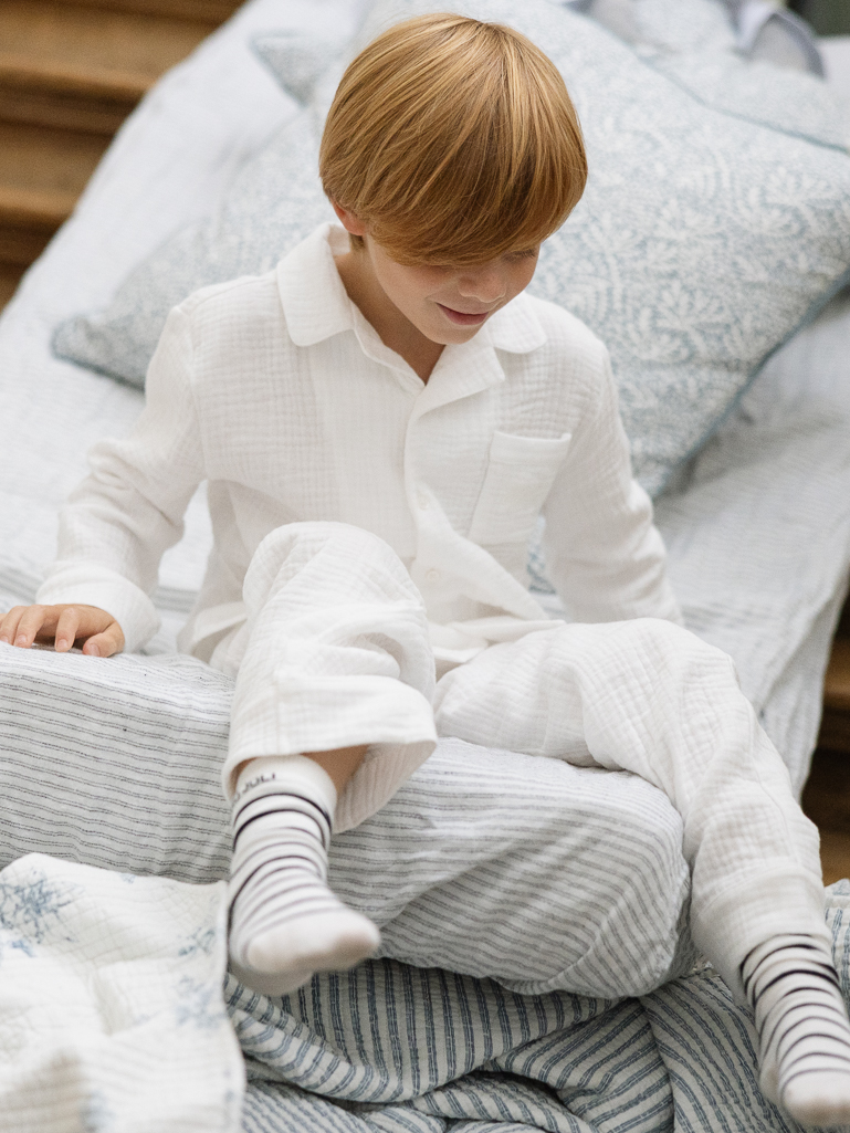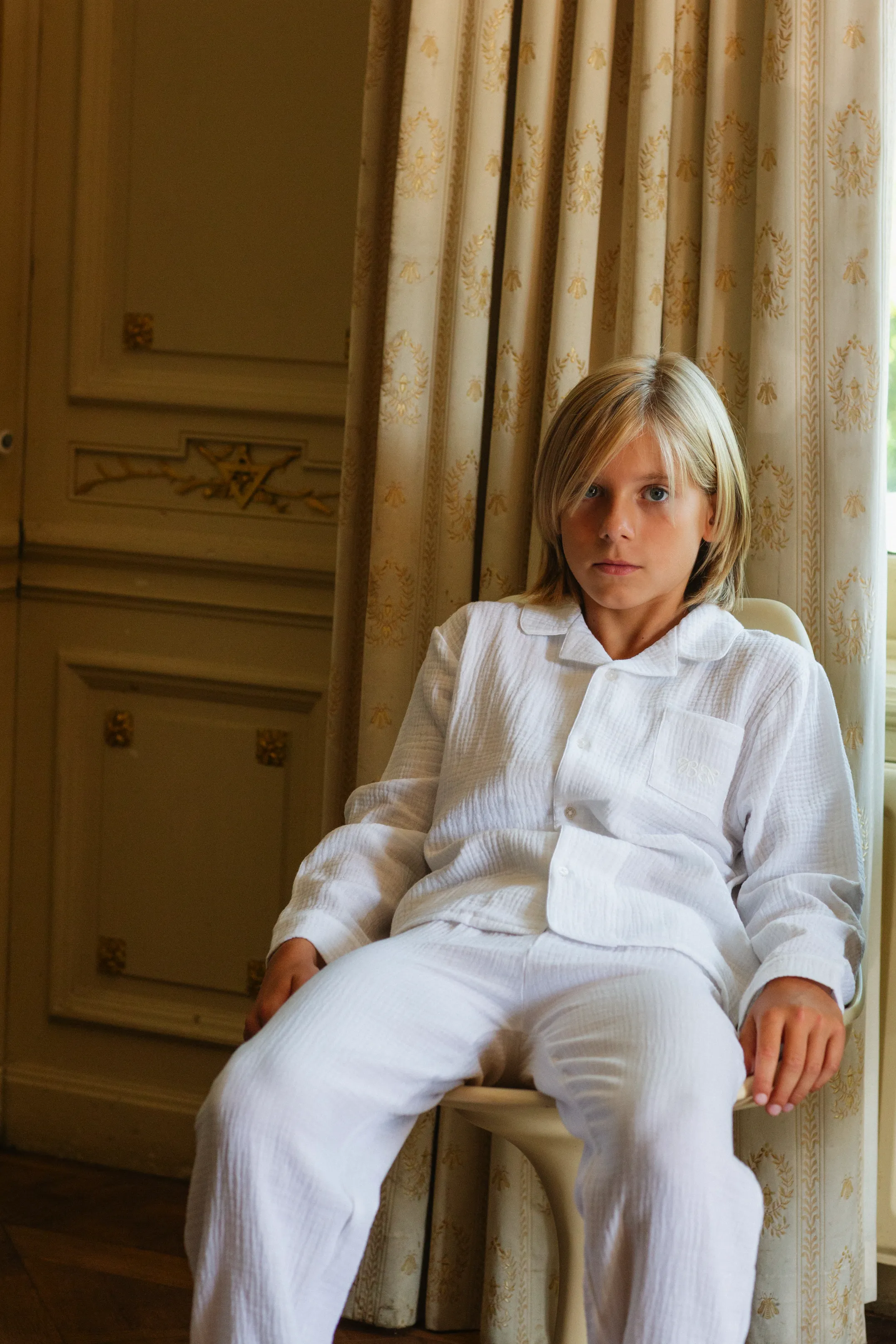 Two-piece pyjama set in airy cotton mousseline with a gently crinkled surface. Designed with monotone embroidery on the chest pocket, its elegance lies in simplicity — enhanced by the clean, pure tone of Milk frais.
