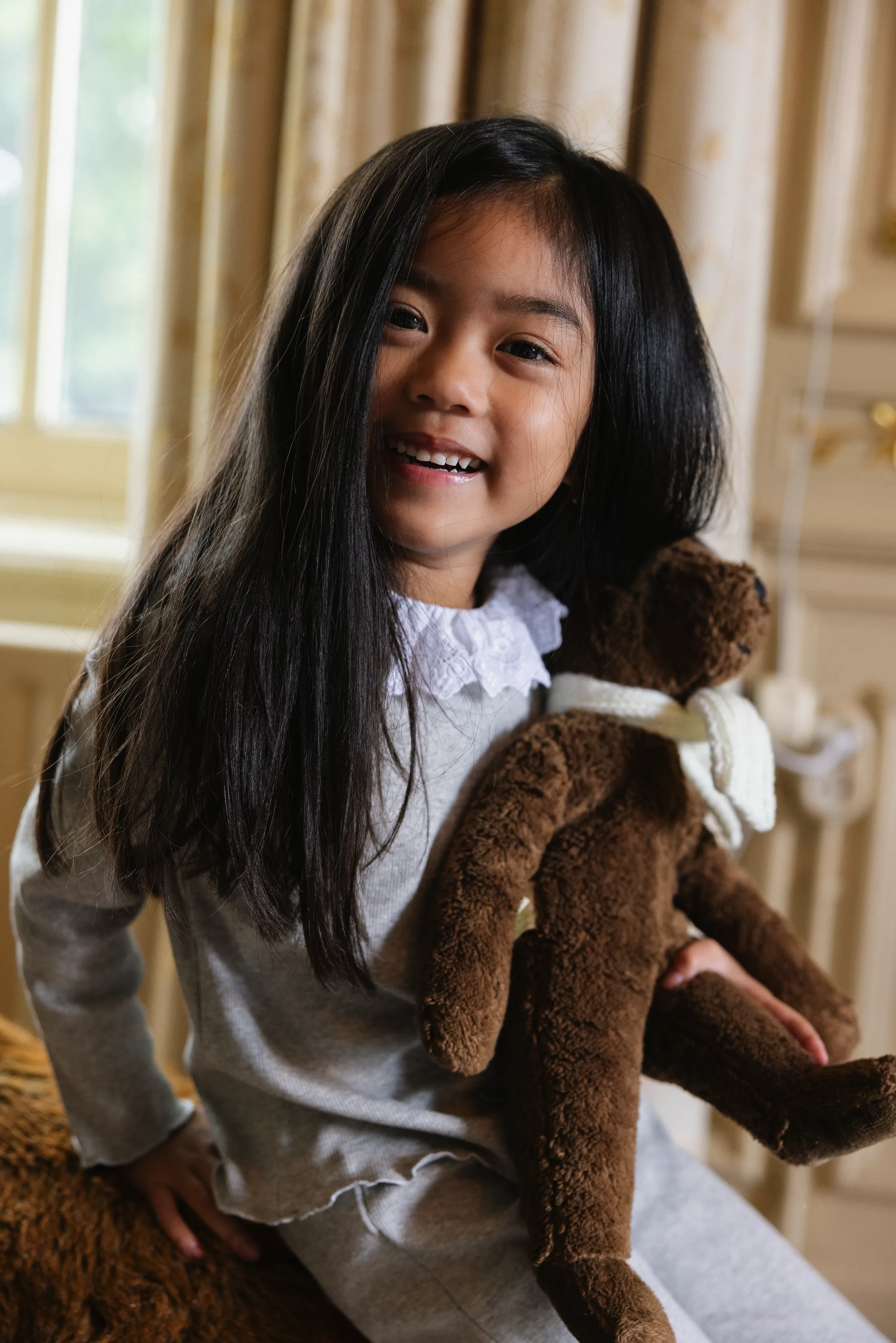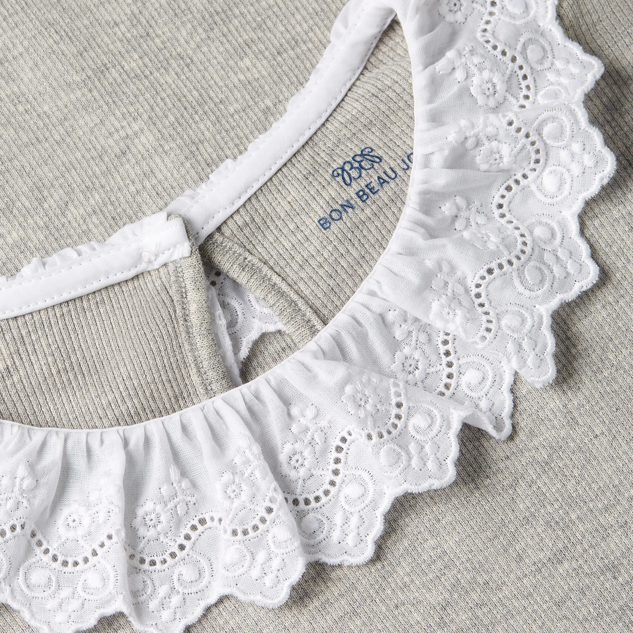 Two-piece pyjama set in soft ribbed cotton with gentle elasticity for easy comfort. The slender fit and handcrafted ruffle collar make it refined and elegant, with Grey nuage adding a calm, timeless presence.