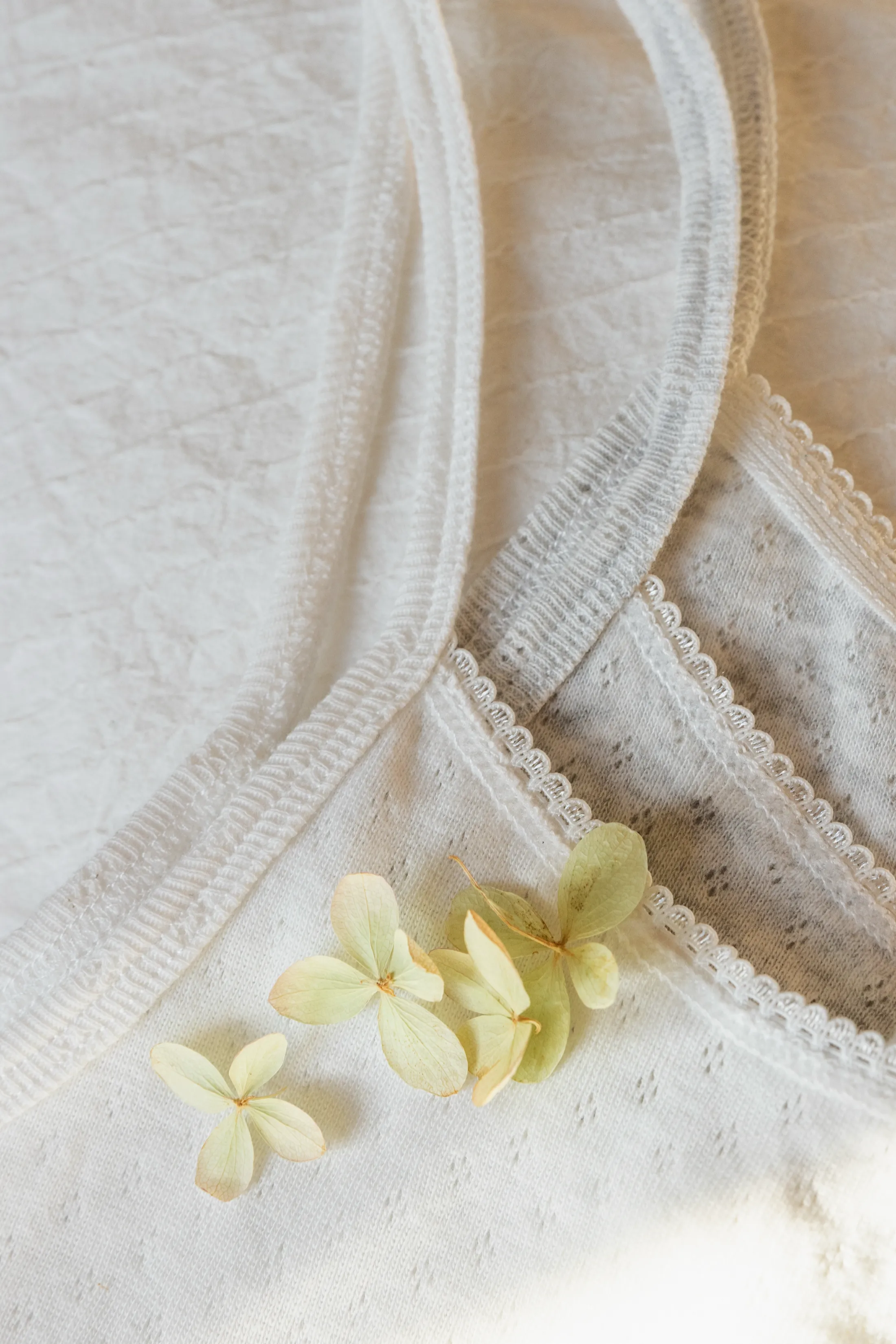 Two singlets in airy cotton pointelle with a delicate structure. Finished with fine lace trims, the White and Grey ajour pairing feels graceful and timeless.