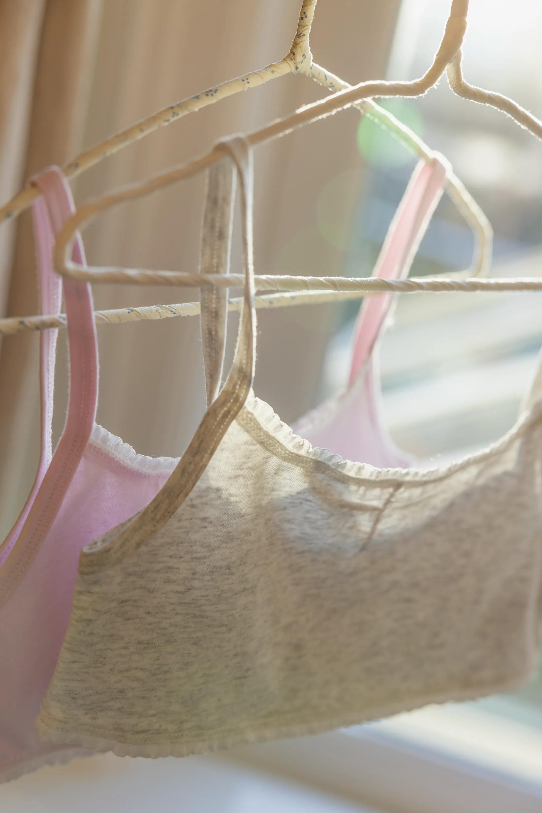 Two cropped singlets made from brushed cotton jersey, edged with silky ruffles for a refined touch. Pink poudree adds a gentle feminine mood, while Grey nuage brings balance and sophistication.