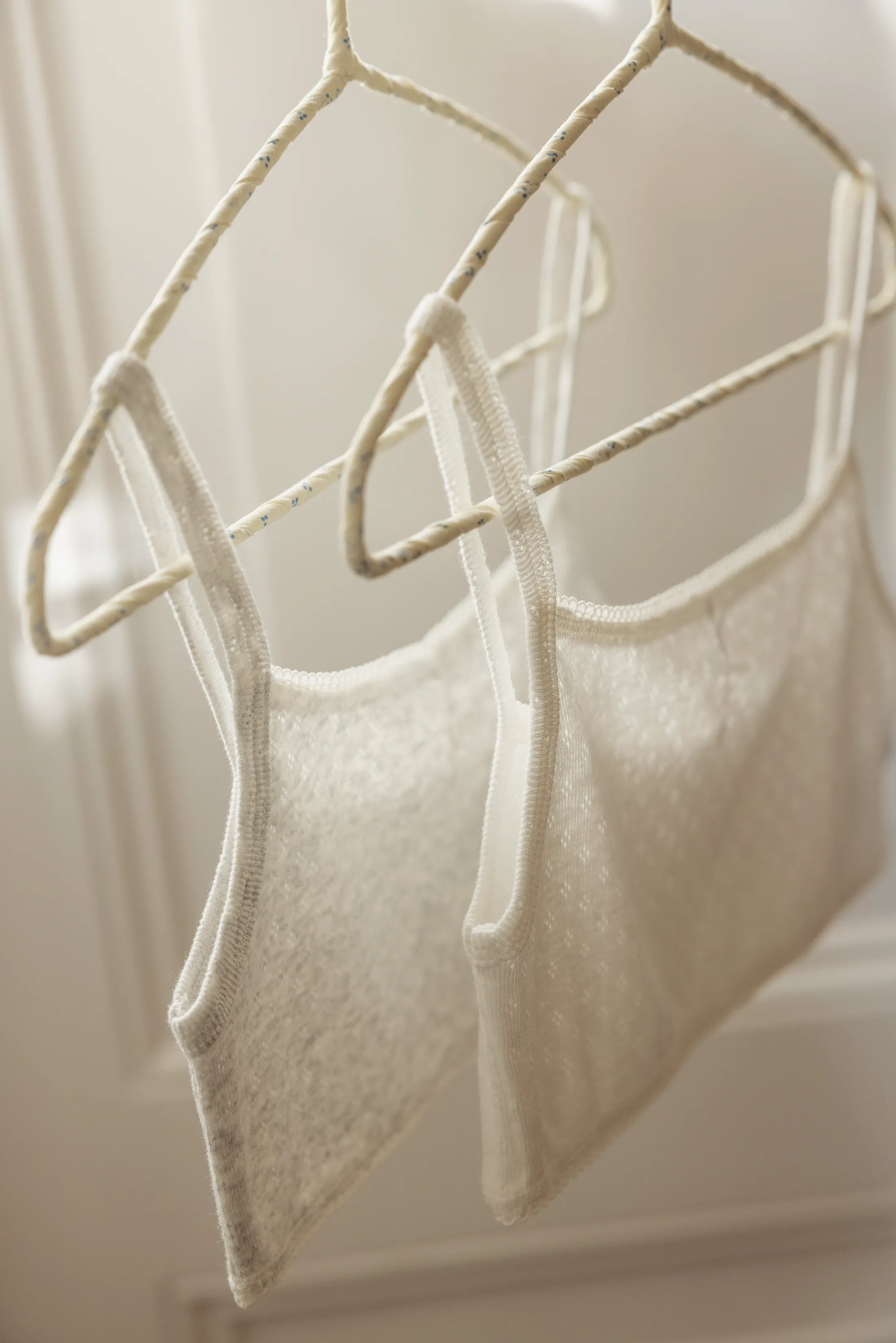 Two cropped singlets in light cotton pointelle with delicate lace trimming. The White and Grey ajour tones give this set an effortlessly classic appeal.