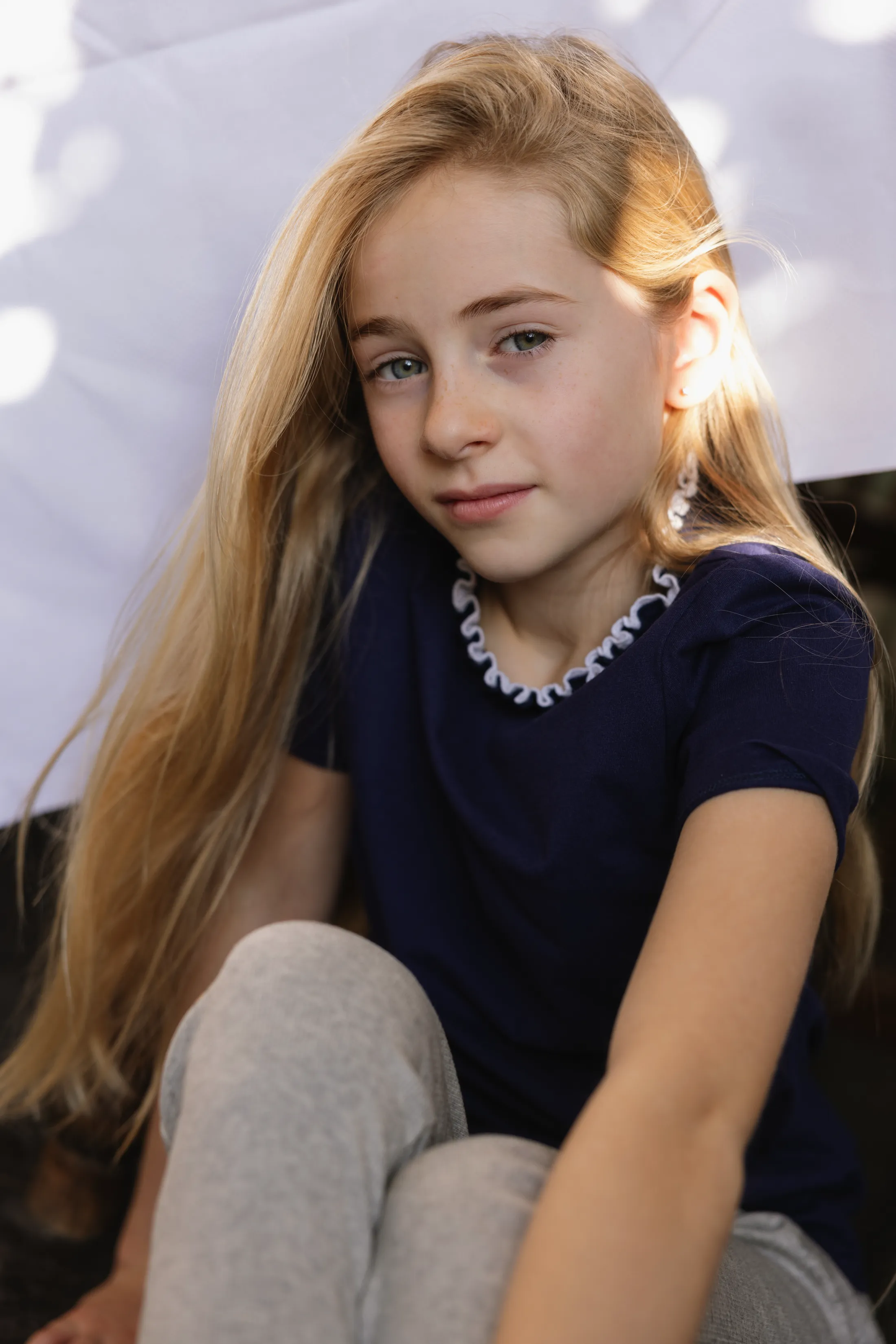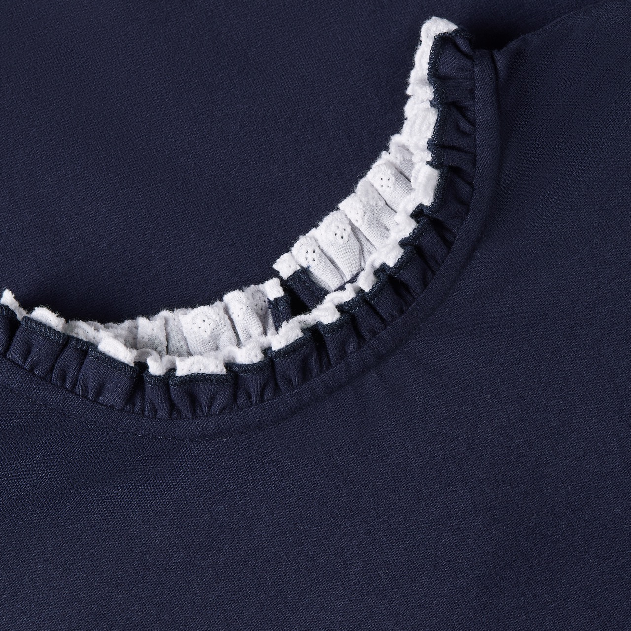 Short-sleeved top in smooth brushed cotton jersey, finished with a graceful double ruffle collar. The deep tone of Blue minuit gives this easy silhouette an elegant and quietly confident character.