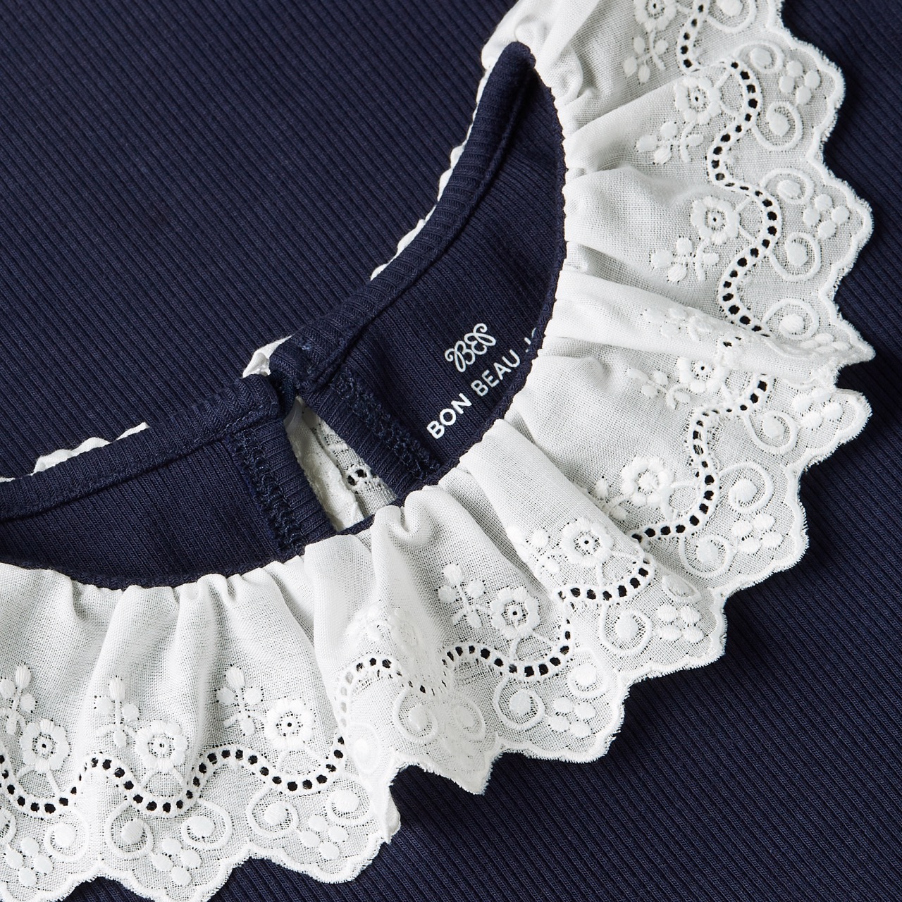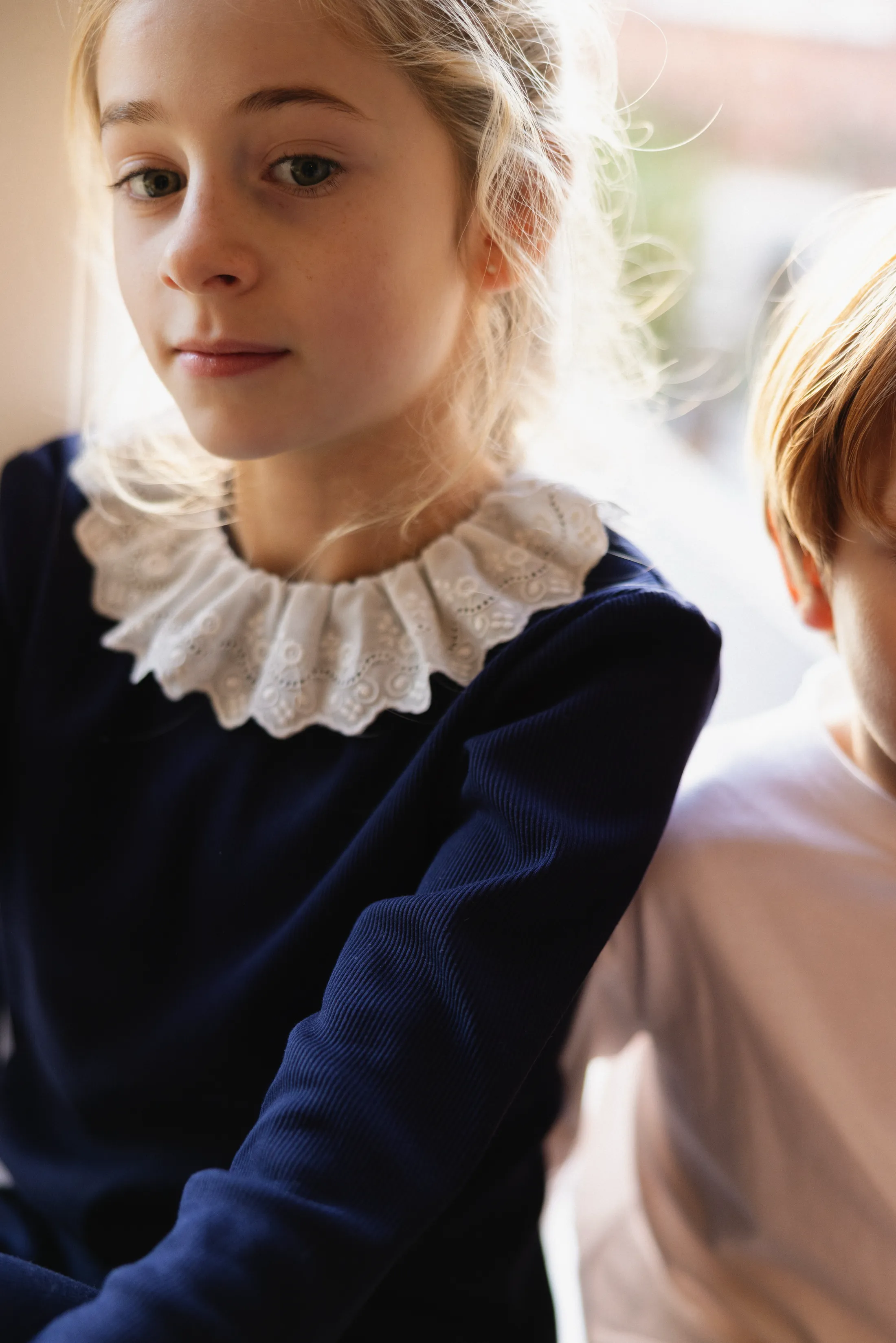 Long-sleeved top made from fine rib cotton that feels soft yet structured. The crafted ruffle collar lends quiet charm, balanced by the depth and elegance of Blue minuit.