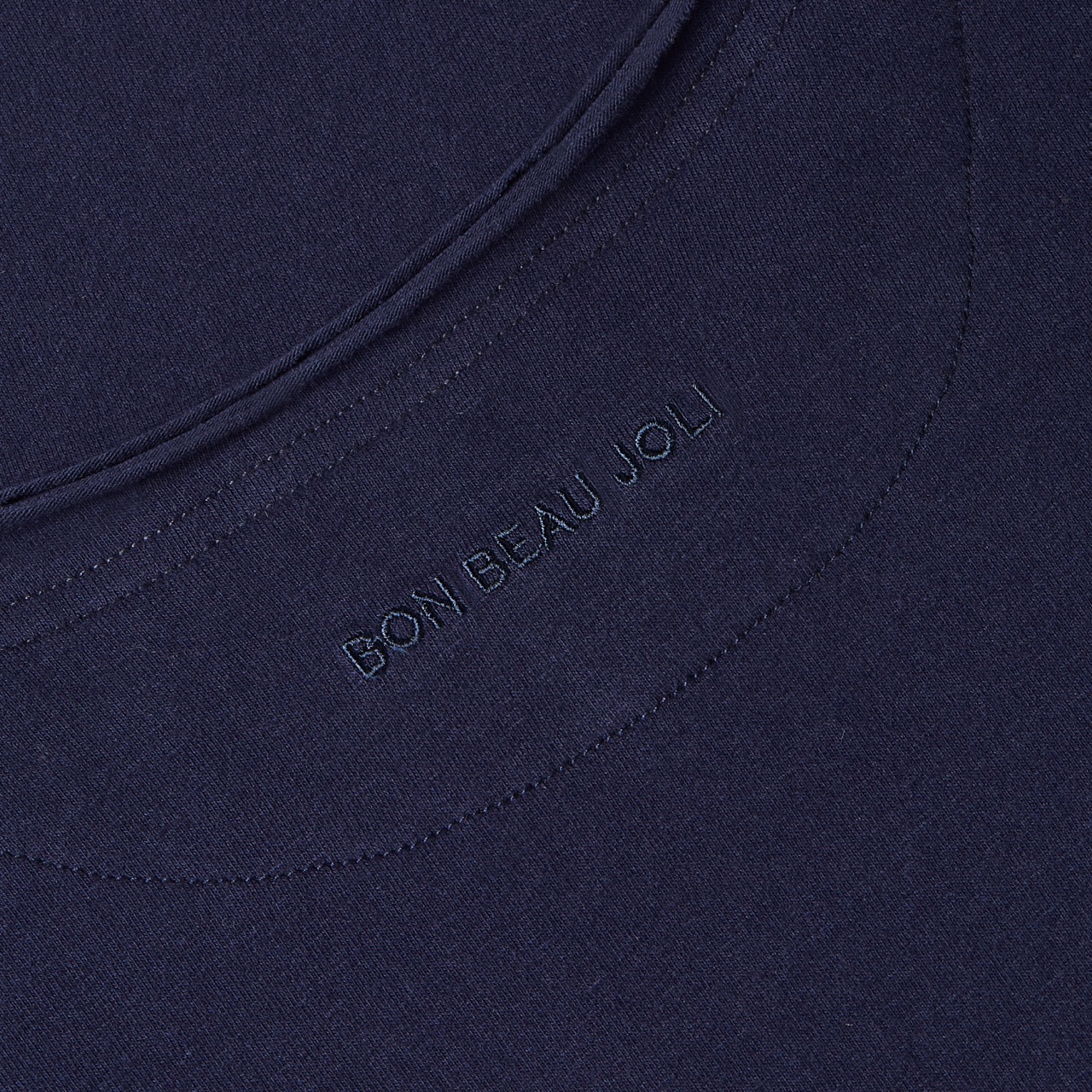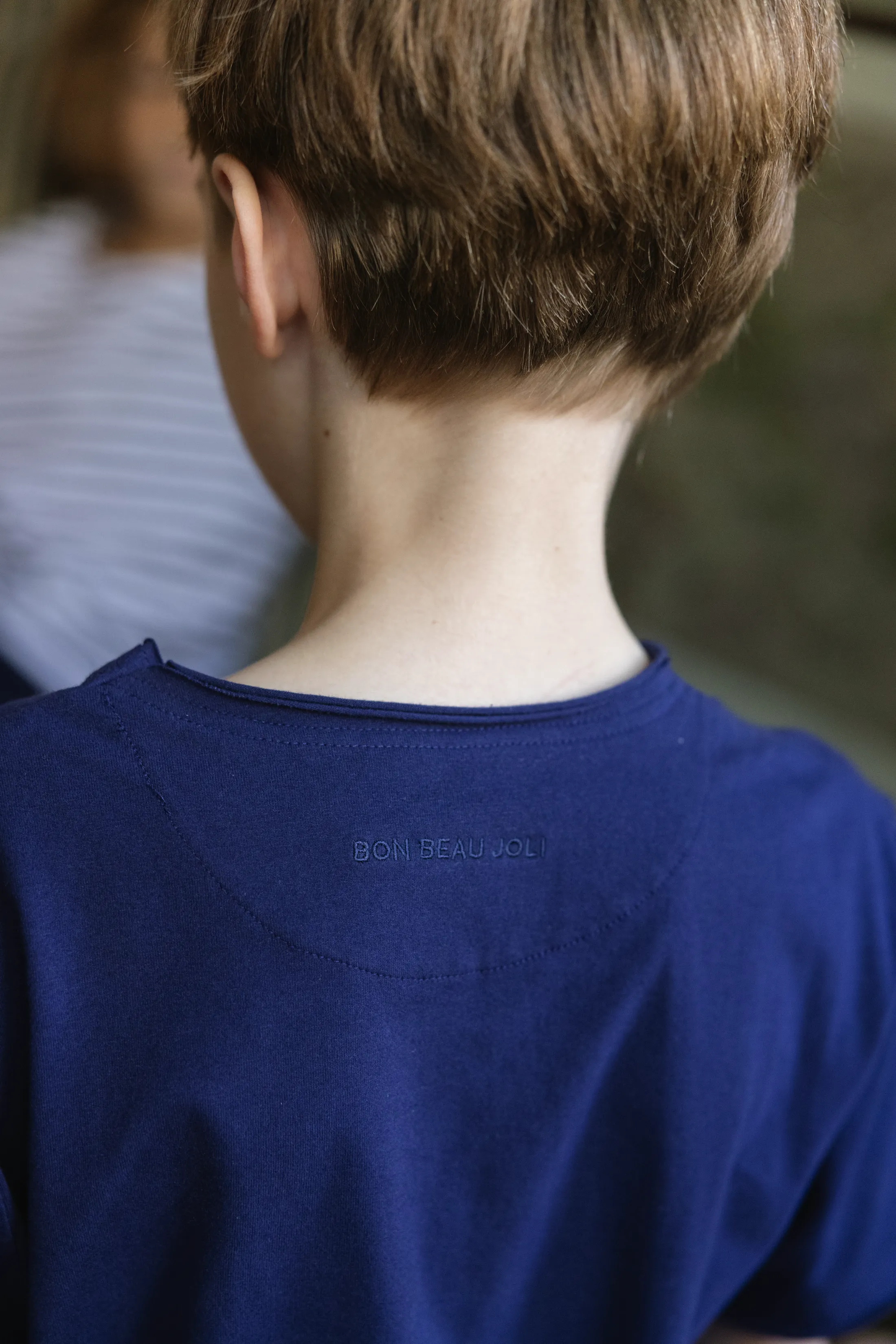 Short-sleeved shirt made from brushed cotton jersey with a soft, smooth feel. The loose fit and double rolled edges create modern ease, enriched by the depth of Blue minuit. A tonal embroidery of our wordmark on the back introduces a refined, understated detail.