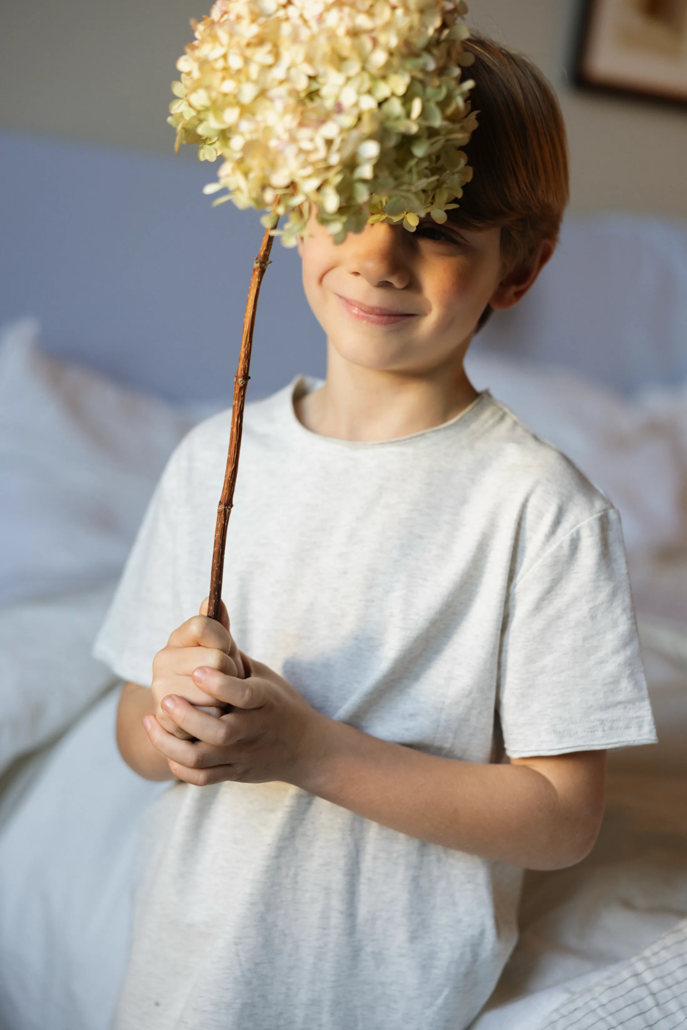 Short-sleeved shirt in brushed cotton jersey, softly cut for a relaxed drape. Double rolled edges add casual polish, and Grey nuage brings a muted, versatile tone. A tonal embroidery of our wordmark on the back introduces a refined, understated detail.