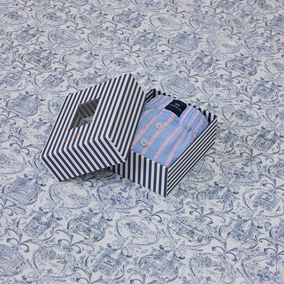 Boxer short cut from crisp woven cotton featuring a soft two-tone combination of Pink sorbet and Whisper blue. The wide silhouette feels effortless, blending ease with subtle elegance.
