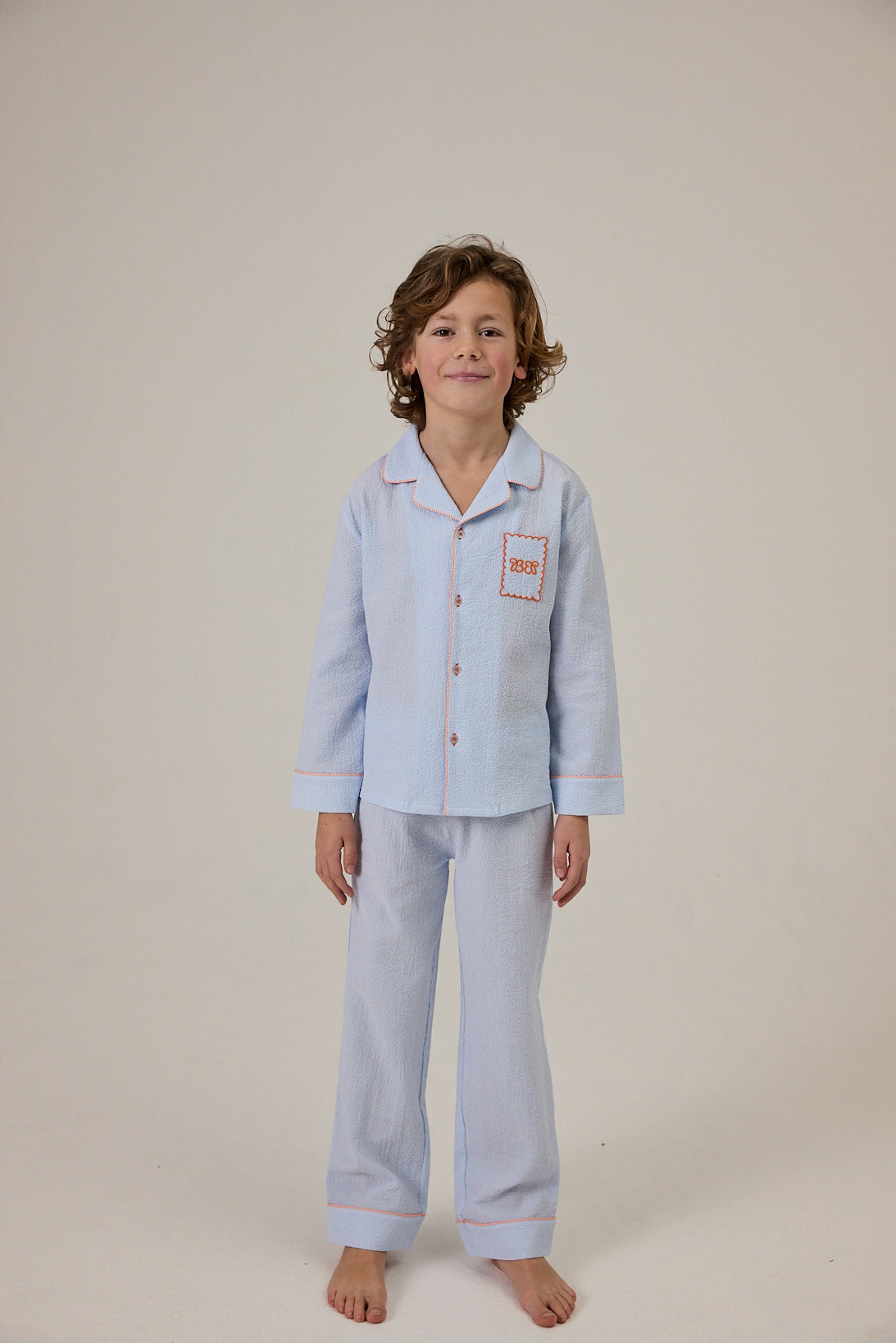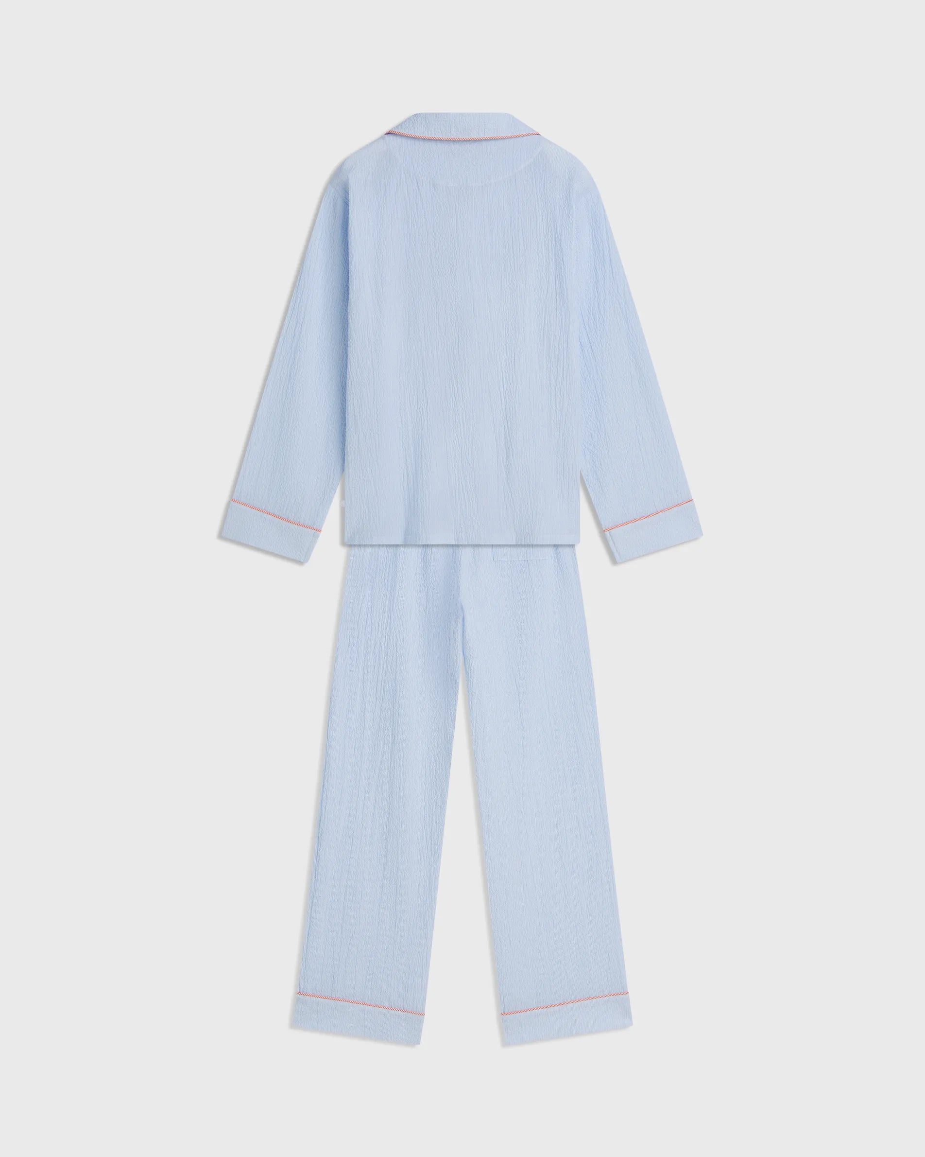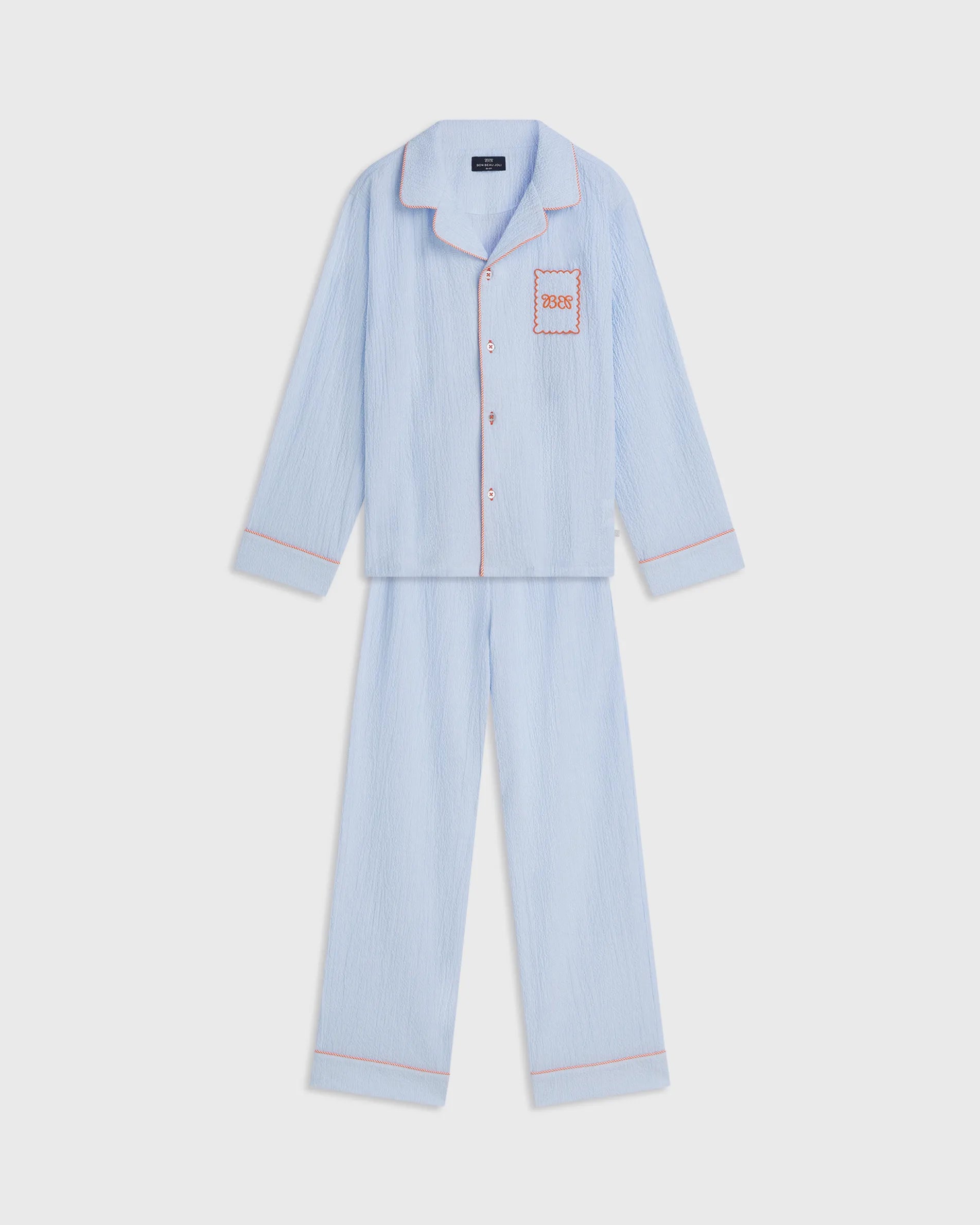 Two-piece pyjama set cut from stretch seersucker cotton that feels cool and soft to wear. Elegant orange embroidery decorates the chest pocket, while Bleu etoile brings a crisp, timeless mood.