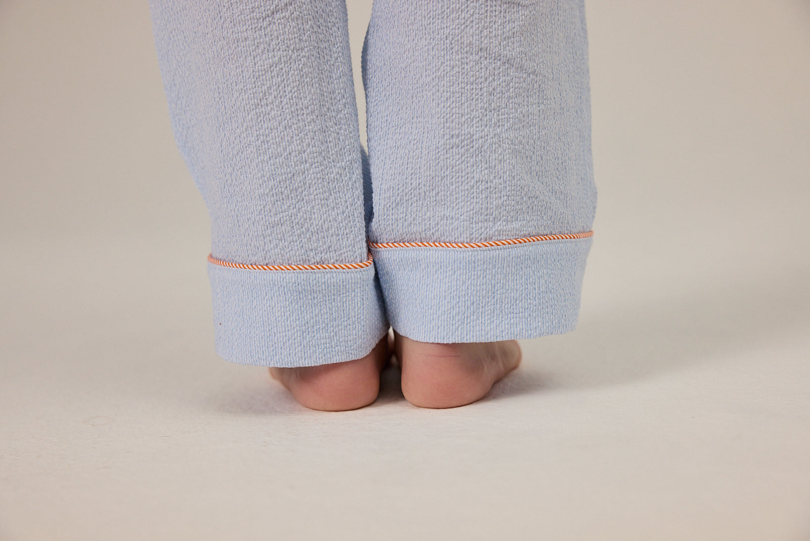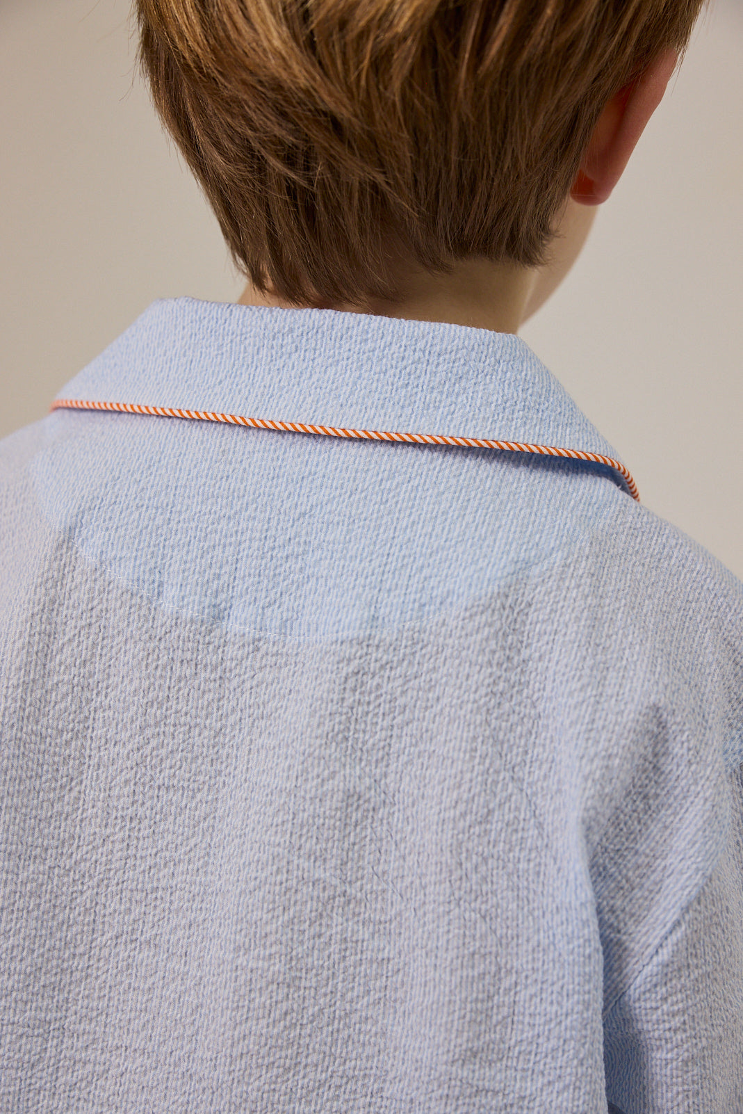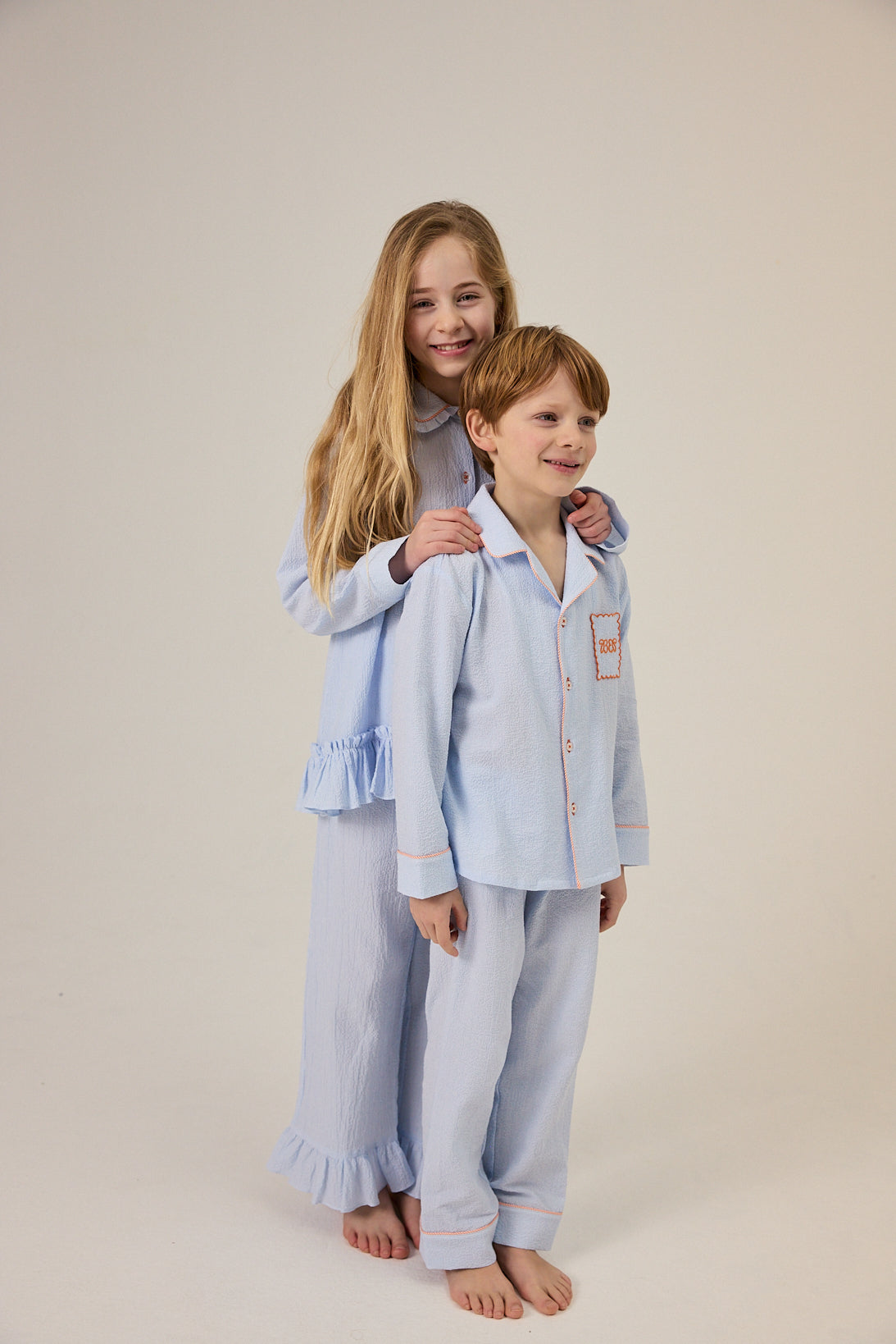 Two-piece pyjama set cut from stretch seersucker cotton that feels cool and soft to wear. Elegant orange embroidery decorates the chest pocket, while Bleu etoile brings a crisp, timeless mood.