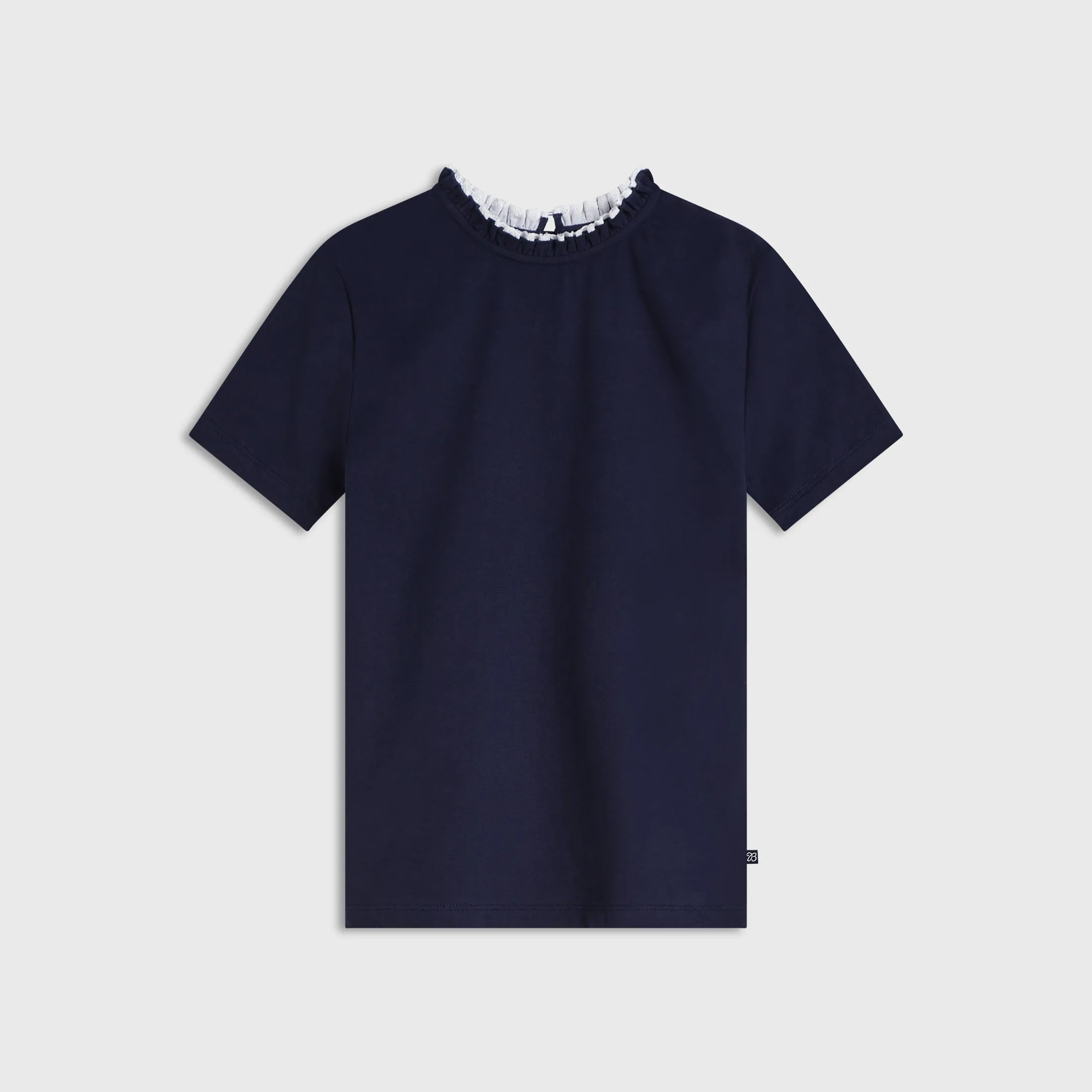 Short-sleeved top in smooth brushed cotton jersey, finished with a graceful double ruffle collar. The deep tone of Blue minuit gives this easy silhouette an elegant and quietly confident character..