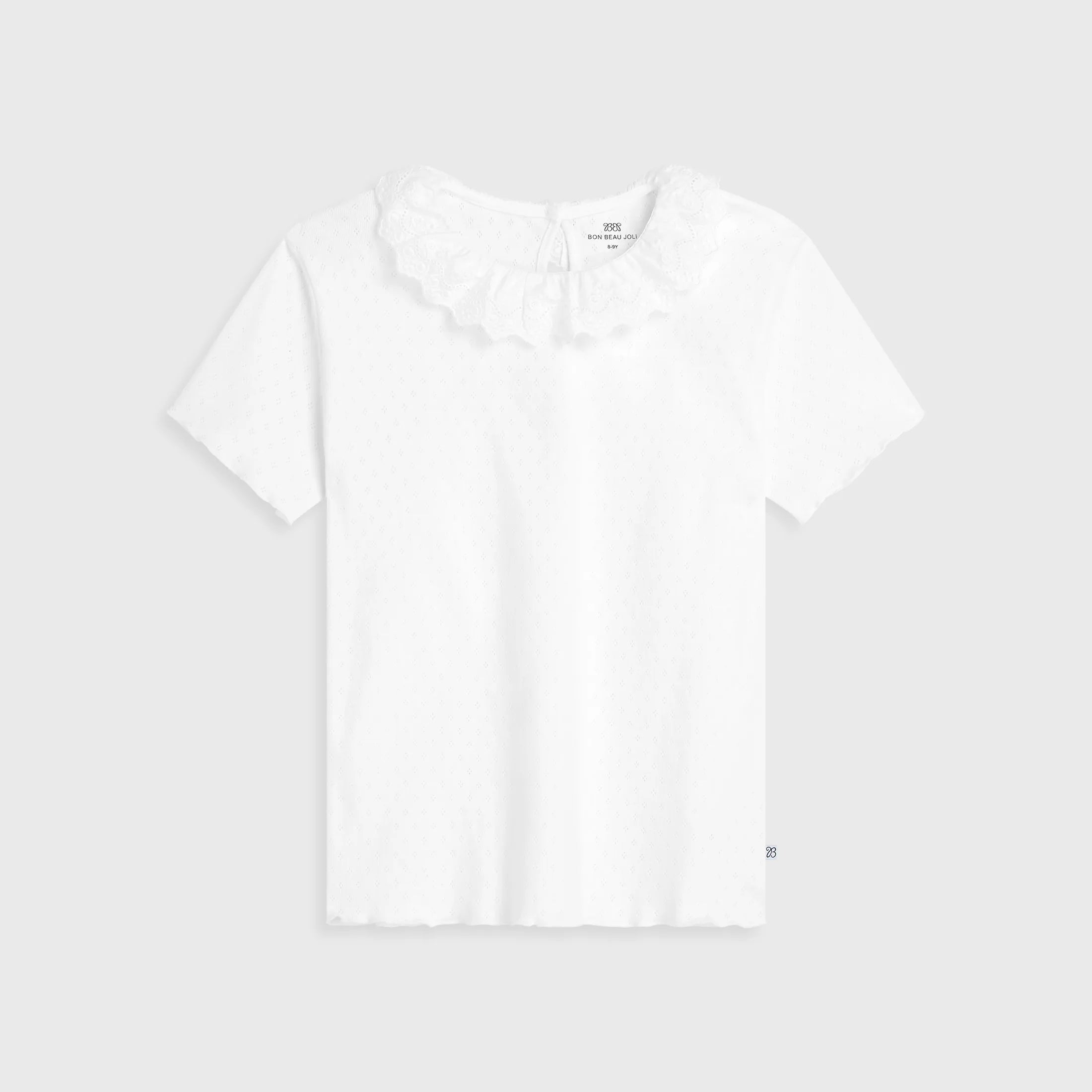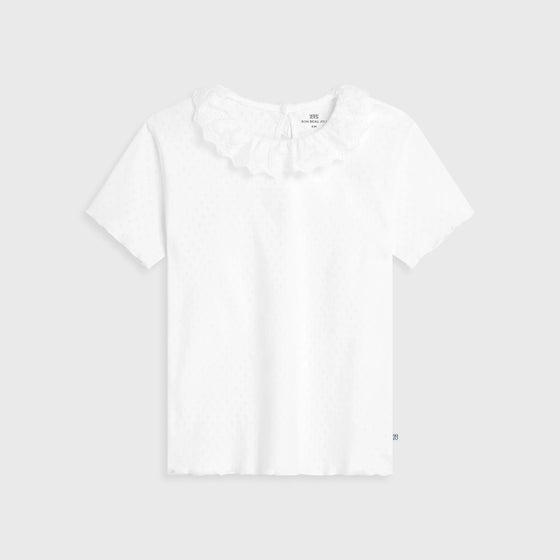 Short-sleeved top made from delicate cotton pointelle with a naturally airy texture. The handcrafted ruffle collar gives a soft French note, while White ajour enhances its graceful purity.